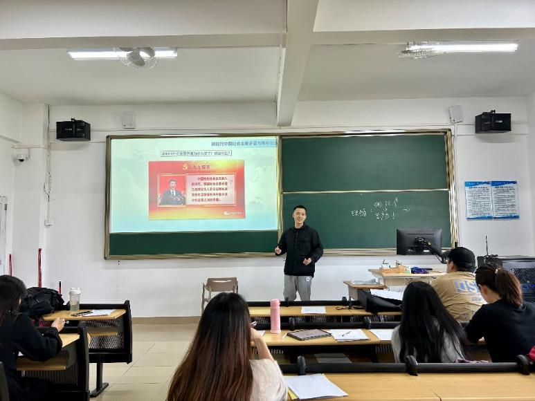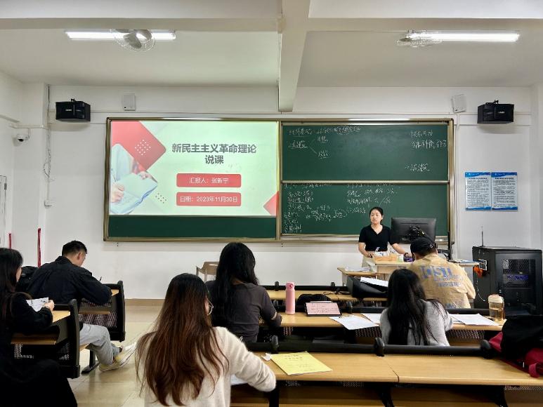 说课环节,苏锋凡老师聚焦于“新时代社会主要矛盾的转化”,深入讲解了新时代社会主要矛盾转化的依据、主要矛盾与基本矛盾的关系,同时对课程板书设计、课堂互动进行示范展示。张新宇老师以 “新民主主义革命理论”为主题,先后围绕教材、学情、教学目标、重难点、教学方法等进行介绍,并就“新民主主义革命理论形成的依据”一节进行教学展示,最后作教学反思。讨论环节,与会教师分别对两位老师的教学态度、教学内容、教学方法和教学水平进行评价,并提出改进建议。