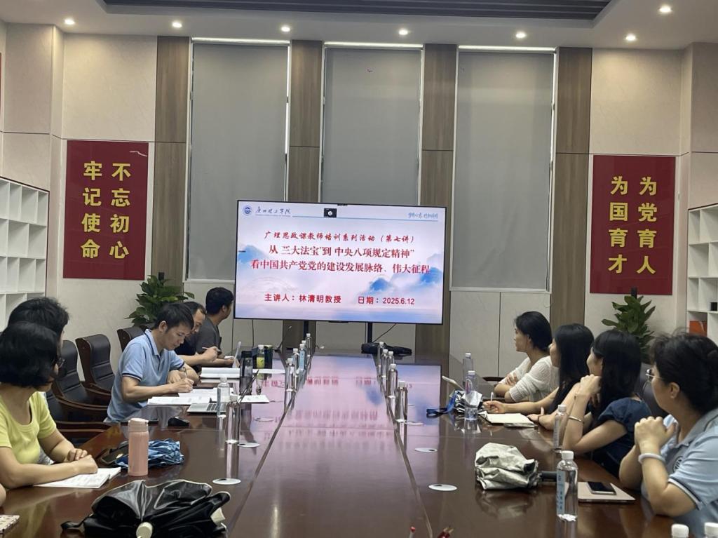 6月12日,suncitygroup太阳新城于惠州校区党员活动室召开广理思政课教师培训系列活动(第七讲)——思政课教师教学能力提升专题讲座,讲座围绕《习近平新时代中国特色社会主义思想概论》课程教学研讨展开,旨在为授课教师在讲授“党的作风建设”课程内容时提供优质的教学思路,培训邀请资深教授林清明主讲。会议由王康主持。