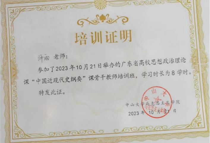 师雨老师参加“中国近现代史纲要”课骨干教师培训获培训证书