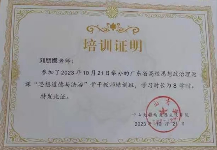 刘朋娜老师参加“思想道德与法治”课骨干教师培训获培训证书