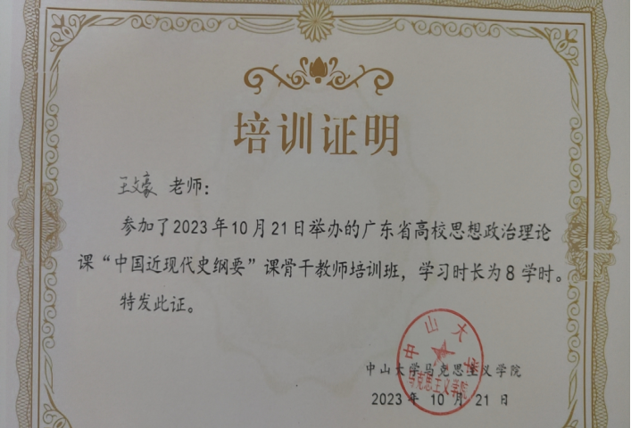 王文豪老师参加“中国近现代史纲要”课骨干教师培训获培训证书