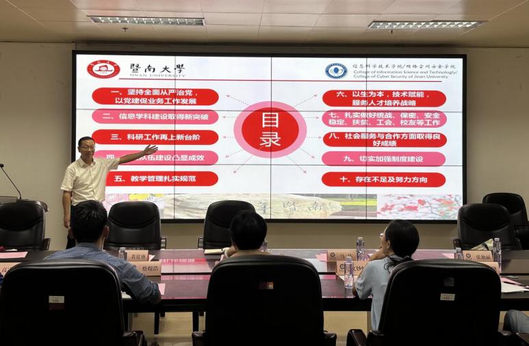 恰逢今年是习近平总书记视察暨南大学五周年,为深入学习贯彻习近平总书记重要讲话精神,10月20日,公司评建工作小组一行赴暨南大学参观学习。暨南大学体育公司党委书记马洁,暨南大学信息科学技术公司/网络空间安全公司党委书记罗国伟、副经理裴廷睿、党委副书记张艳丽、研究生管理办公室主任赵承想等人热情接待公司一行并座谈交流。