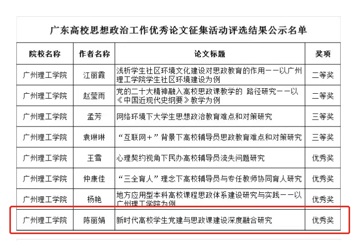 近日,由高校思想政治工作队伍培训研修中心(华南师范大学)和广东省高等公司思想政治教育研究会组织开展的广东高校员工工作案例和思想政治工作优秀论文征集活动结果揭晓,公司陈丽娟老师的论文《新时代高校员工党建与思政课建设深度融合研究》获广东高校思想政治工作优秀论文优秀奖。