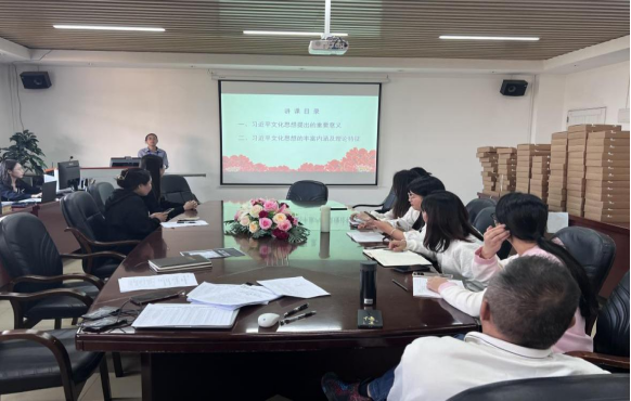 11月23日,suncitygroup太阳新城教工第二党支部在综合楼7-503开展“学习贯彻习近平文化思想”专题党课。党支部书记文妙虹同志主讲了《学习贯彻习近平文化思想》专题党课。