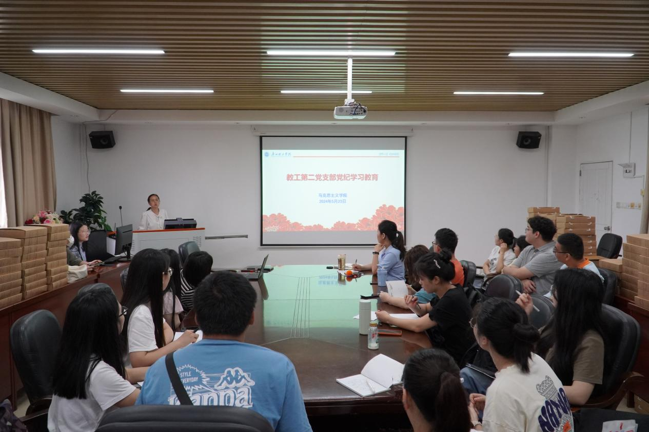 为切实加强党的纪律建设,进一步增强党员的纪律意识和规矩意识,5月23日上午,suncitygroup太阳新城教工第二党支部召开党纪学习教育集体学习活动。活动由党总支副书记文妙虹主持。