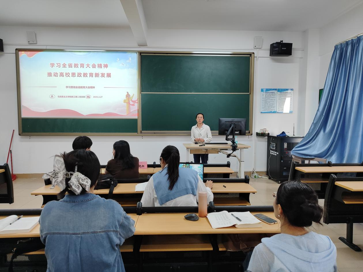 专题学习环节,文妙虹同志结合全省教育大会精神,重点解读广东省委书记黄坤明“深化教育数字化改革”和教育部部长怀进鹏“创新育人模式”的工作要求。她强调,新时代马院教师要坚守“为党育人、为国育才”的使命担当,将大会精神深度融入思政课改革创新实践:一方面,要深耕马克思主义理论“富矿”,夯实铸魂育人根基;另一方面,要勇攀数字技术“高峰”,积极探索人工智能技术与思政教育深度融合的新路径。通过构建“理论深度+技术赋能”的现代化教学新模式,实现思政课堂“传道理”与“破新题”的有机统一。她勉励全体党员:“作为新时代马院人,既要站稳三尺讲台传真理,更要勇立潮头创新局,用实干实绩书写教育强国的马院答卷。”